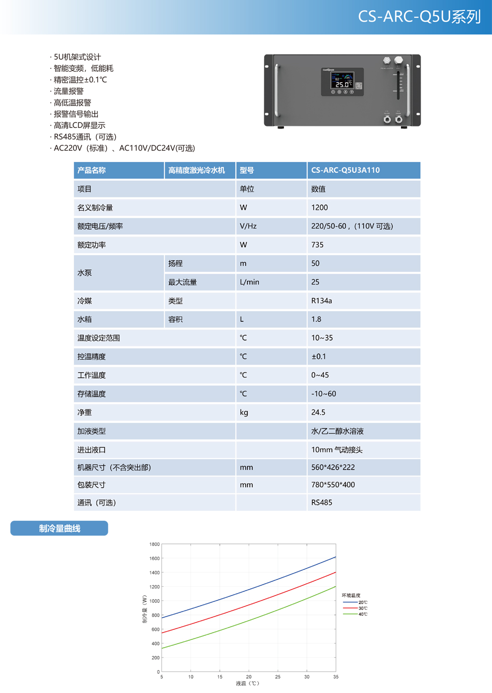 機架式高精度冷水機 Q5U 系列非常適合實驗室內對中低功率設備的散熱與溫度控制需求。名義制冷量達 1200W,溫控精度高達 ±0.1℃,搭配高低溫與流量報警、智能變頻等安全與節能特性,可穩定為多種科研儀器提供精準冷卻支持。廣泛應用于中低功率激光實驗平臺、精密光學與光譜儀器等場景。Q5U 的機架式設計便于集成至實驗室機柜與測試平臺,幫助研究人員在長時間實驗中保持設備運行穩定性,提高實驗數據的可靠性與重復性。