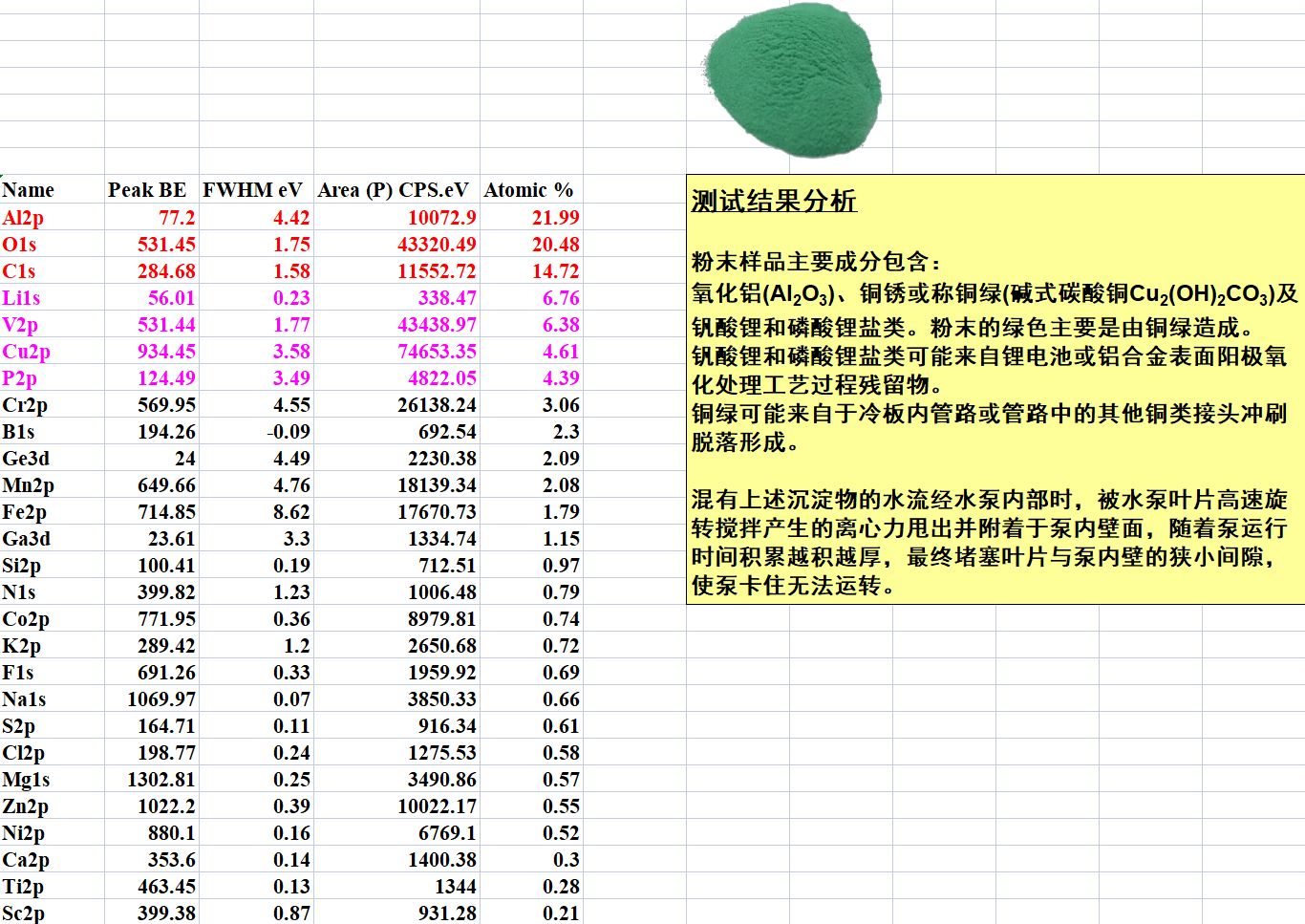 粉末的綠色主要是由銅綠造成;