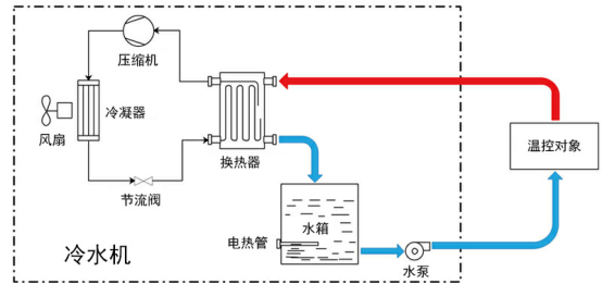 水泵、水箱、控制系統、傳感器、過濾罐等。酷凌時代冷水機可在控制系統上接入通訊,實時監控冷水機運行狀態,實現遠程調節與故障報警。