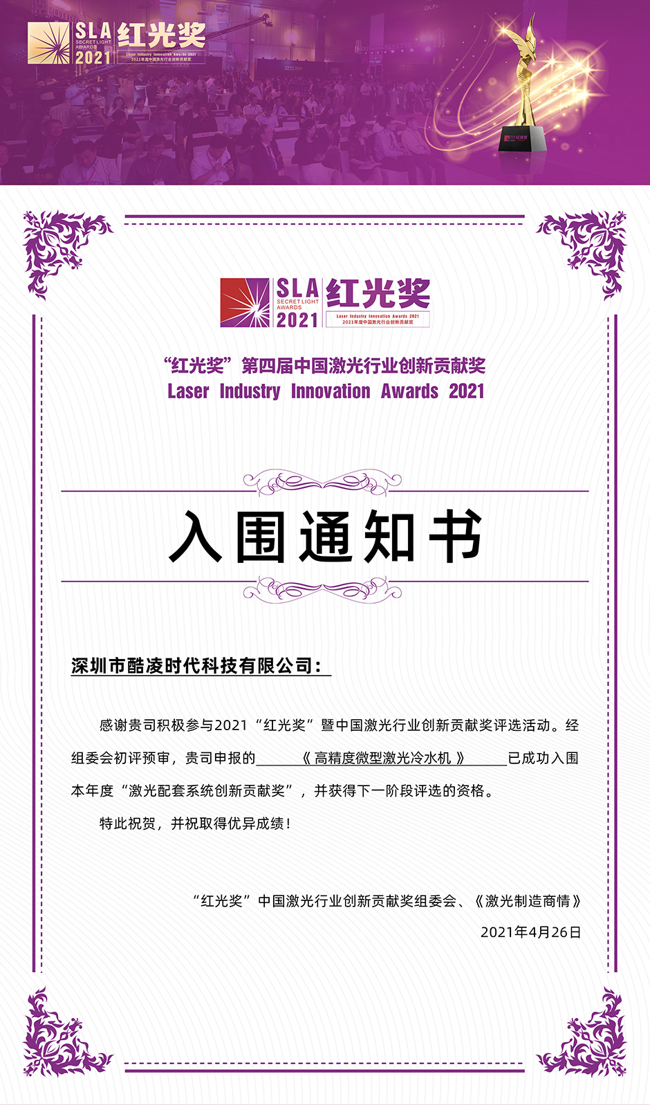 酷凌時代深感榮幸,此次公司申報項目產品成功收獲入圍通知書并收到主辦方此次年度盛宴的入場券,與9月27日 參加2021第四屆“紅光獎”頒獎典禮及答謝晚宴,我們萬分激動, 在此特別感謝“紅光獎”中國激光行業創新貢獻獎組委會及《激光制造商情》。