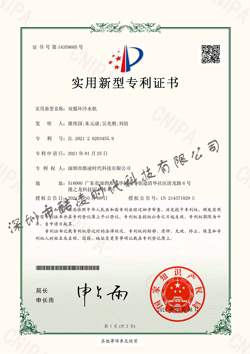 如上就是酷凌時代此次授權公告的實用新型專利的大概內容介紹。 深圳市酷凌時代科技有限公司是一家專業致力于微環境降溫技術研發、方案設計和產品制造的國家高新技術企業。公司始終堅持走“自主知識產權”、“產學研結合”之路,目前公司擁有相關知識產權50余項。目前公司產品已經逐漸形成小型高精度激光冷水機助力工業互聯、智能穿戴式人體降溫系統推動軍民融合兩條產品系列。尤其是針對工業激光設備配套使用而研發及生產的微型激光冷水機、紫外激光冷水機、高精度激光冷水機、3D打印激光冷水機、超快激光冷水機等降溫設備,經過多年深耕,在降溫行業已有了長足深入的發展,目前在國防、科技、工業、農業、健康等諸多領域得到了迅猛發展和廣泛應用。
