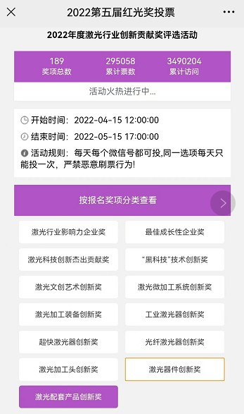 為期一個(gè)月的2022“紅光獎(jiǎng)”首輪投票比拼已經(jīng)進(jìn)入倒計(jì)時(shí)階段,自4月15日投票通道開啟以來,共133家入圍企業(yè)開啟了“瘋狂”宣傳、“花式”拉票模式,微信群、朋友圈出現(xiàn)刷屏、霸屏現(xiàn)象。個(gè)人、企業(yè)、社會(huì)各界紛紛為參評企業(yè)搖旗吶喊,讓激光科技惠及各行各業(yè)。