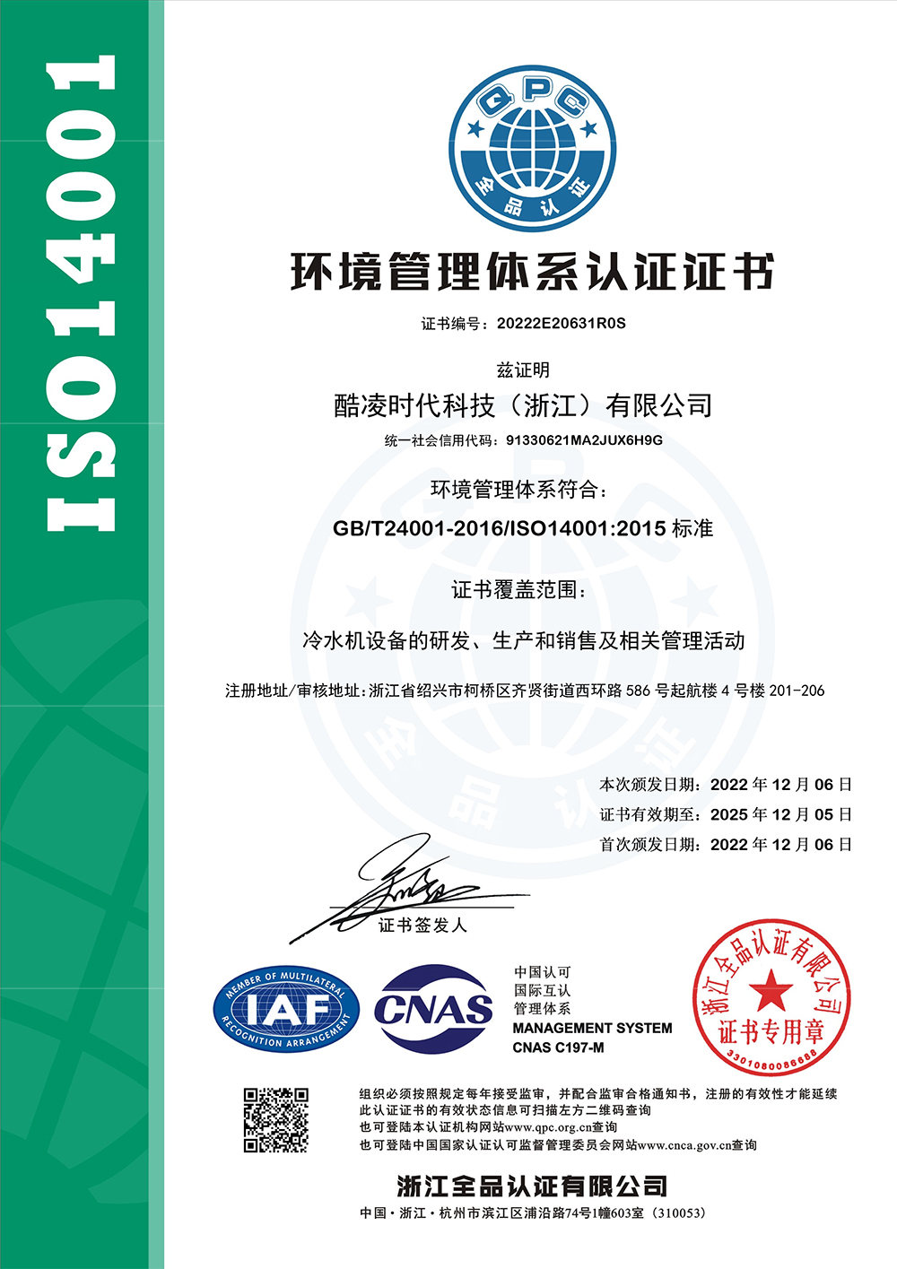 證書覆蓋范圍:冷水機設備的研發、生產和銷售