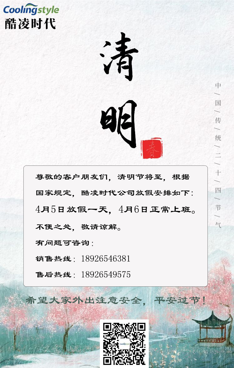 尊敬的客戶朋友們,清明節(jié)將至,根據(jù)國(guó)家規(guī)定,酷凌時(shí)代公司放假安排如下: