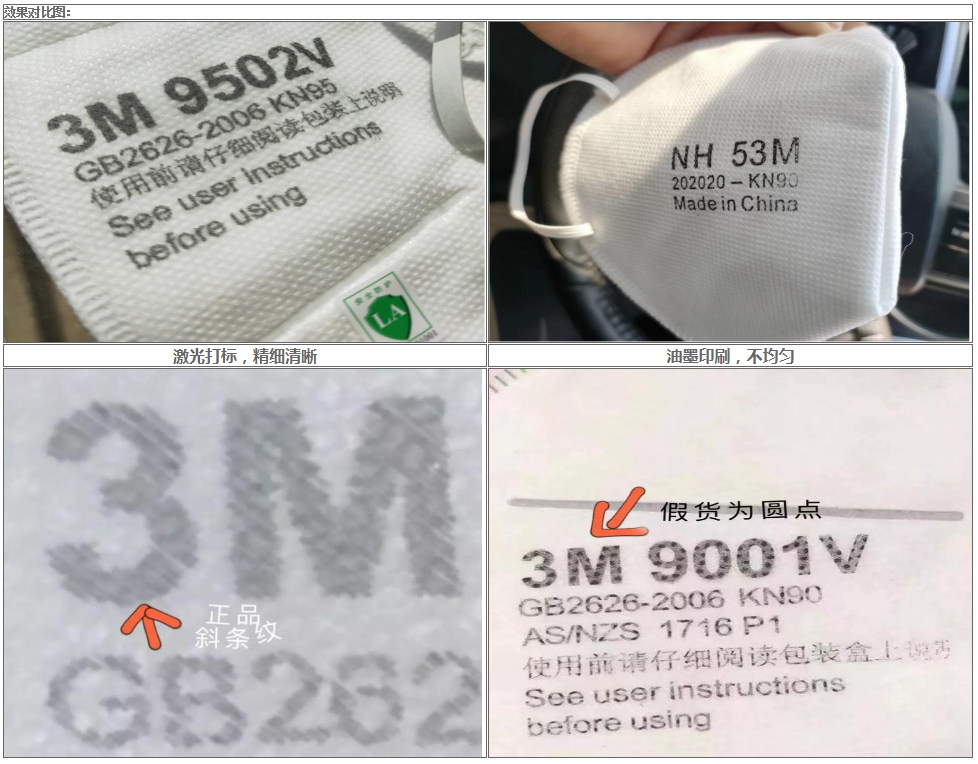 特別是在疫情的這段期間,激光打標(biāo)已經(jīng)成為了鑒別真假口罩,非常直觀的一種鑒別方法。我們可以針對盒裝3MN95/KN95系列口罩,可通過口罩包裝盒上的防偽標(biāo)簽辨別。真口罩的標(biāo)簽,從不同角度看會出現(xiàn)顏色變化,而假口罩的標(biāo)簽則不會變色。對散裝3MN95/KN95系列口罩而言,則可通過觀察口罩上的字體辨別真?zhèn)巍U娴?M口罩文字都是由激光打標(biāo),字體有斜紋,而假貨是由油墨印刷,有圓點(油墨不均勻的痕跡)。