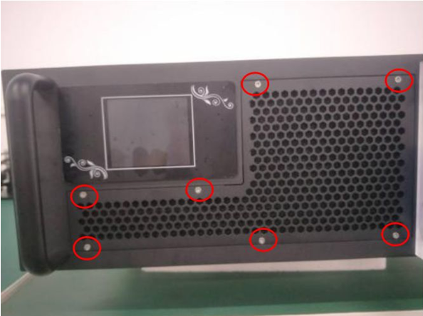 1、將激光冷水機水平放置于平面之上,拆掉固定擋板的7顆螺釘。
