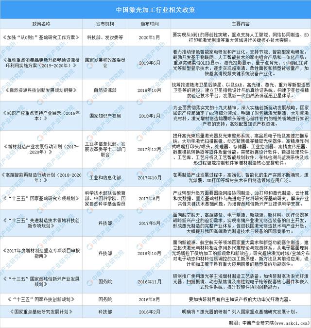 隨著我國制造業(yè)轉(zhuǎn)型升級深層次發(fā)展,我國出臺多項對激光先進制造產(chǎn)業(yè)的鼓勵和支持的產(chǎn)業(yè)政策,如《“十三五”國家戰(zhàn)略性新興產(chǎn)業(yè)發(fā)展規(guī)劃》《國家信息化發(fā)展戰(zhàn)略綱要》《“十三五”國家科技創(chuàng)新規(guī)劃》《加強“從0到1”基礎(chǔ)研究工作方案》等均涉及鼓勵激光制造及相關(guān)智能制造產(chǎn)業(yè)發(fā)展的內(nèi)容,為激光加工行業(yè)發(fā)展提供了良好的政策發(fā)展環(huán)境。