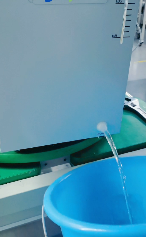 2.先將注水口蓋帽打開(kāi),再將排水口塞子打開(kāi)進(jìn)行排水,等待排水口無(wú)水排出時(shí),稍微將設(shè)備向前方傾斜,進(jìn)一步地將水箱中剩余的水給排出;