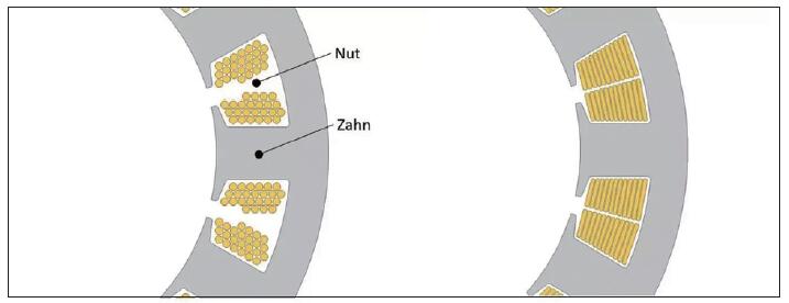 經(jīng)典圓線繞組的橫截面(左)和 3D 打印單個(gè)線圈的橫截面(右)