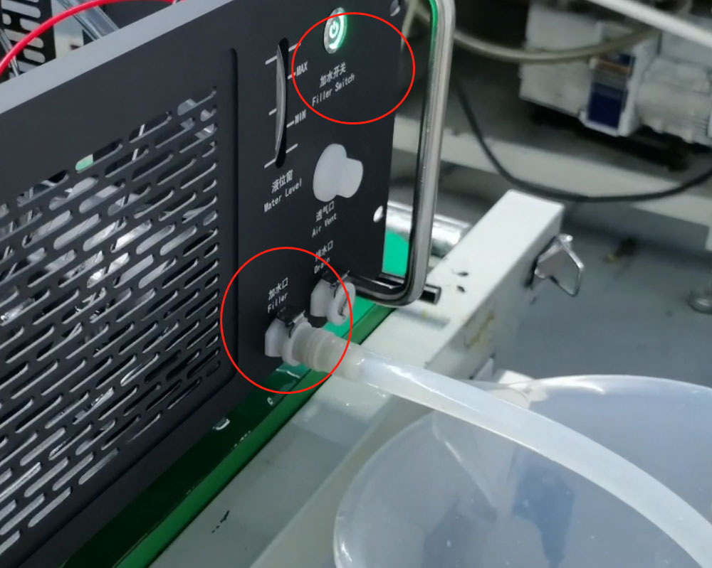 如下圖,我們直接在進水口插上水管,水管另一頭放入水中,打開加水開關,就實現自動加水功能了,同時可以通過液位窗及時查看加水情況,也可以直接通過透氣口,當透氣口有水排出,說明已經加滿了,這個時候就可以關閉加水開關,拔掉加水的水管啦。