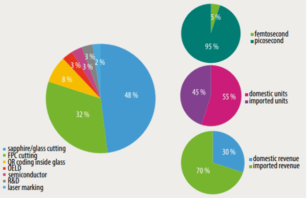 在半導體、顯示器制造和玻璃加工需求的推動下,中國的超快激光市場正在快速增長。2021,超過45家制造商在中國共售出2400臺激光器。銷售的超快激光器中95%是皮秒激光器。飛秒激光只占據(jù)了很小的市場份額。國產(chǎn)激光器占總銷量的55%,但僅占總收入的30%,這表明國產(chǎn)超快激光器的功率水平較低,大多在10至50瓦之間,而進口激光器則用于更高功率的應用。