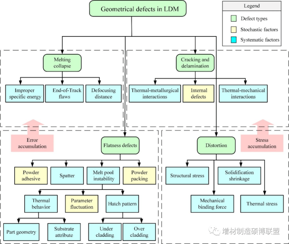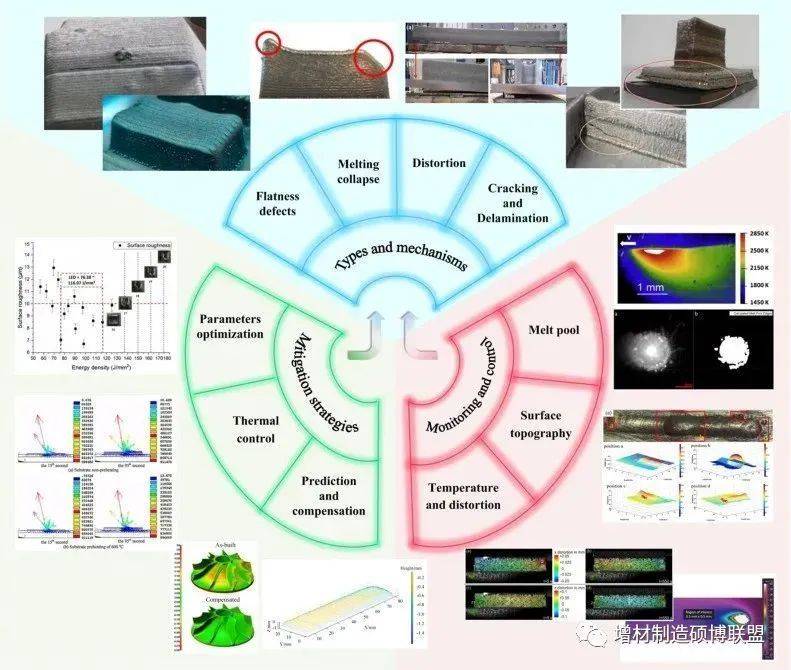 目前,幾何缺陷的形成機制研究包括熔池失穩、復雜的熱歷史、殘余應力、材料/能量波動等,可分為系統性因素和隨機性因素。幾何缺陷的緩解及補償大多為工藝參數調控、預熱緩冷、基于仿真或形貌監測的預變形及補償,結合形成機制—過程監測—缺陷調控的閉環控制系統仍未形成完整體系。